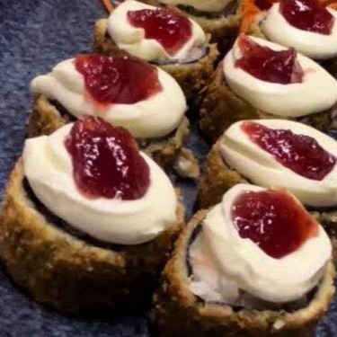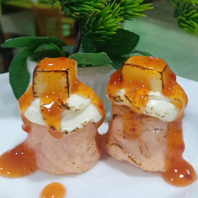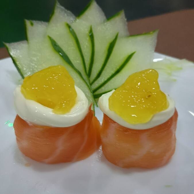 Arroz enrolado com salmão, creme cheese geleia de pimenta