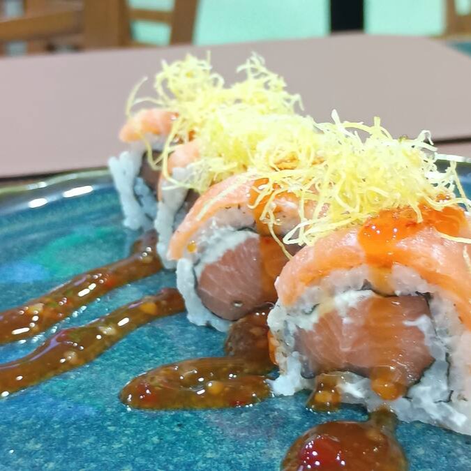 Uramaki especial c/ salmão e crispy de batata doce