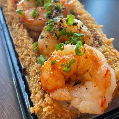 Arroz japonês empanado, com creme Cheese, camarão levemente grelhado, e cebolinha