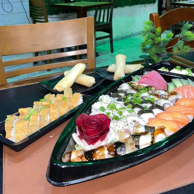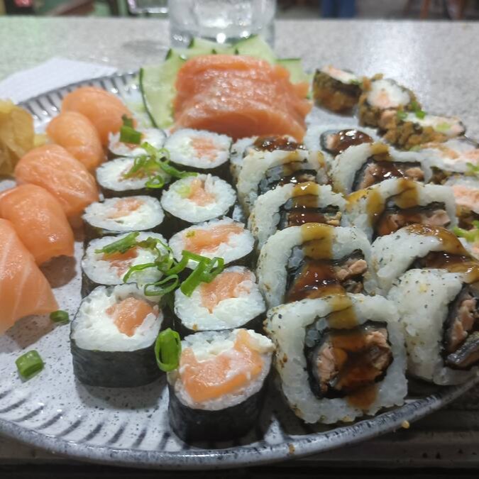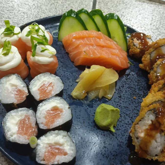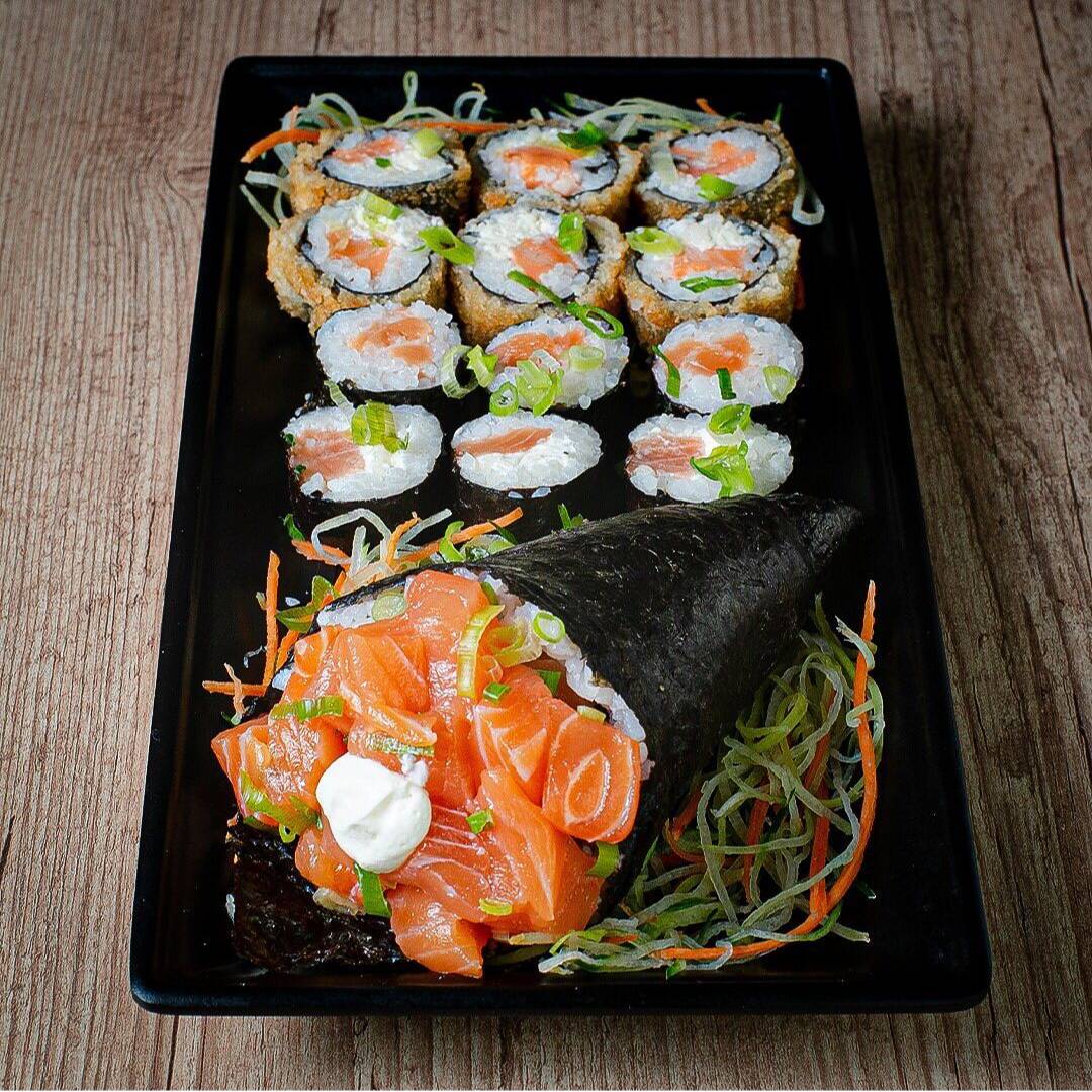 6 Hot Filadélfia, 5 Filadélfia, 3 sushi de salmão, 3 sashimis de salmão, 2 Joe Filadélfia