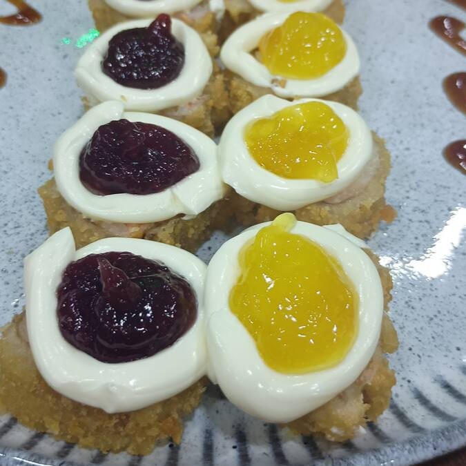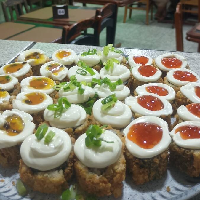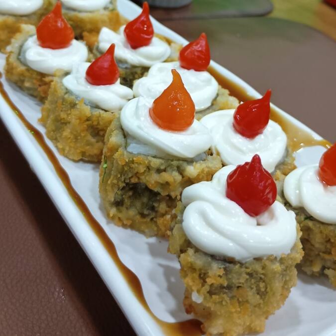 Salmão, camarão empanado, creme cheese, geleia de pimenta, Teriaki e Cebolinha