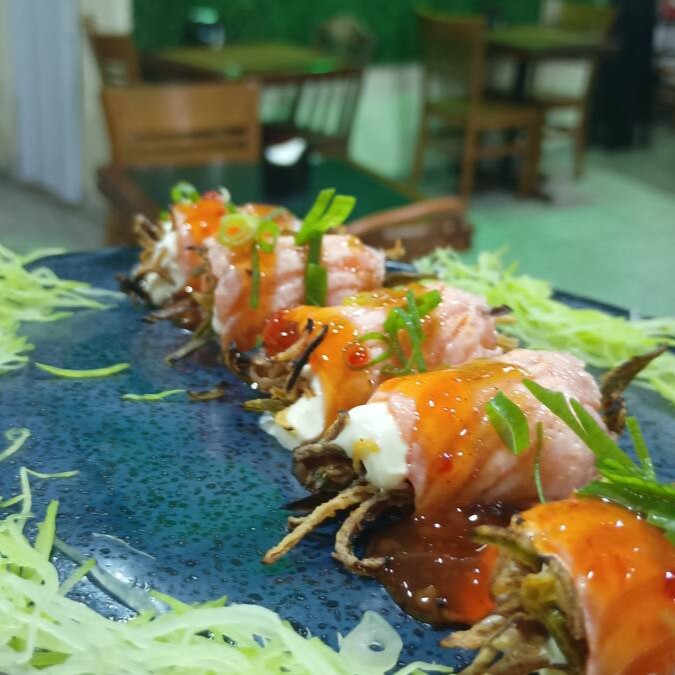 Salmão enrolado no arroz, creme cheese e Crispys de couve