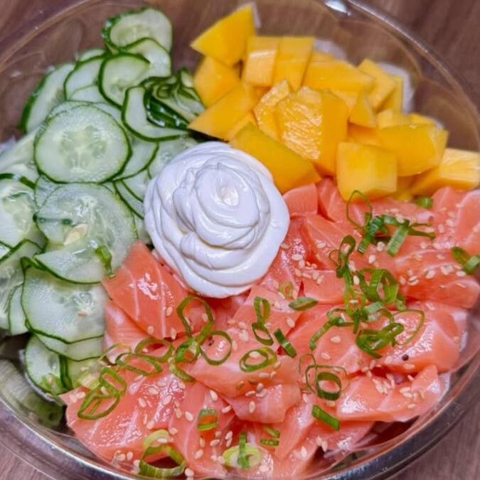 Arroz, salmão, sunomono, manga, creme cheese e gergelim