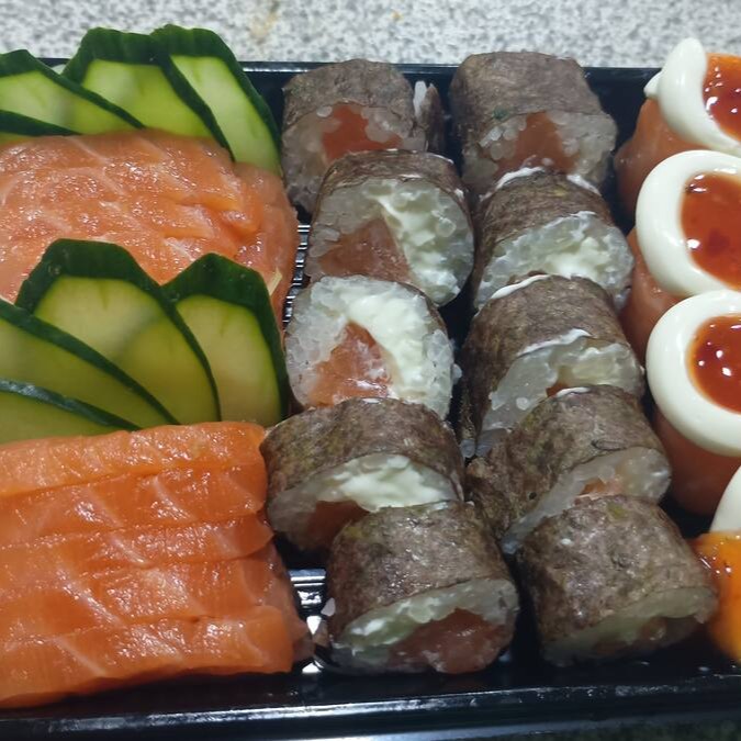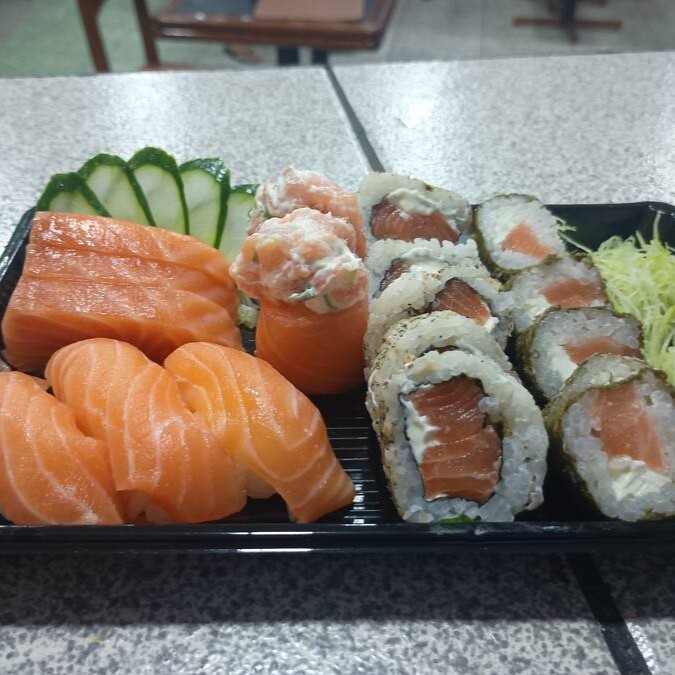 5 Filadélfia, 5 uramaki Filadélfia, 3 sashimis de salmão, 3 sushi salmão, 2 Joe tataki