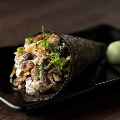 Temaki feito com a pele do Salmão grelhado