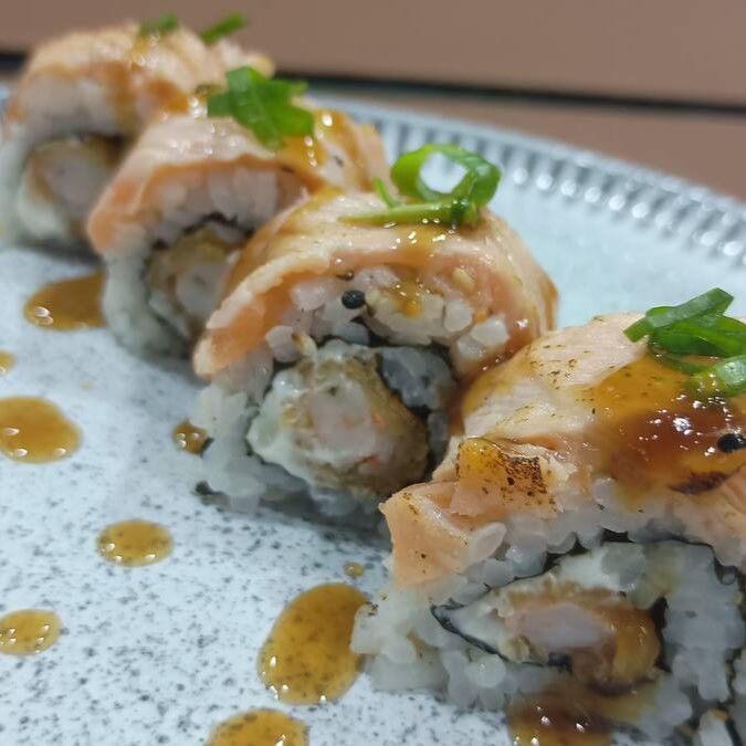 Roll com arroz por fora, camarão empanado dentro e salmão maçaricado por cima