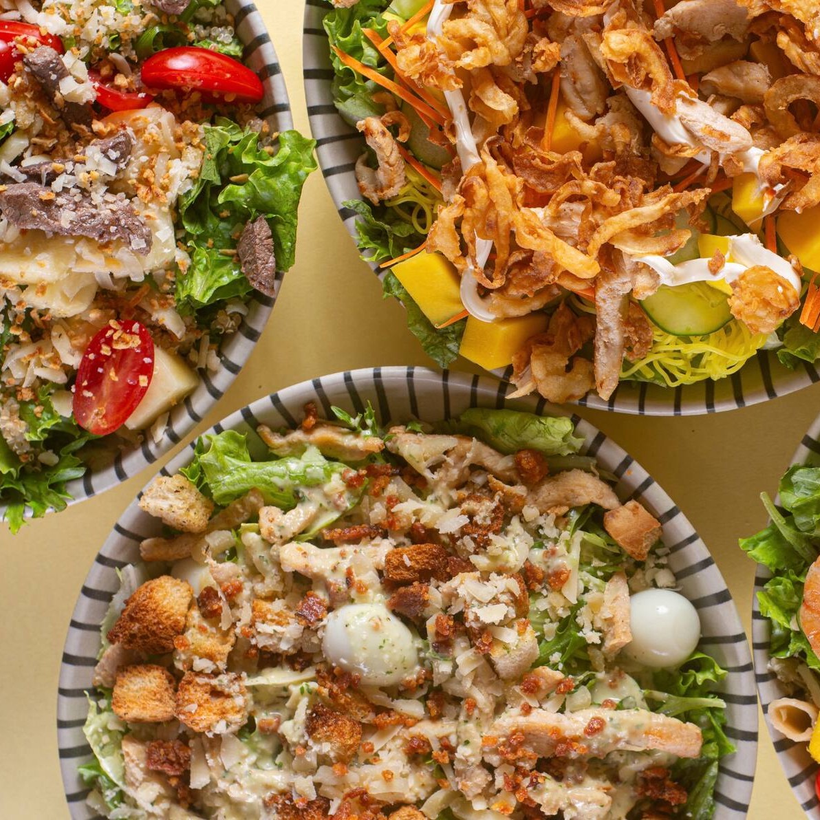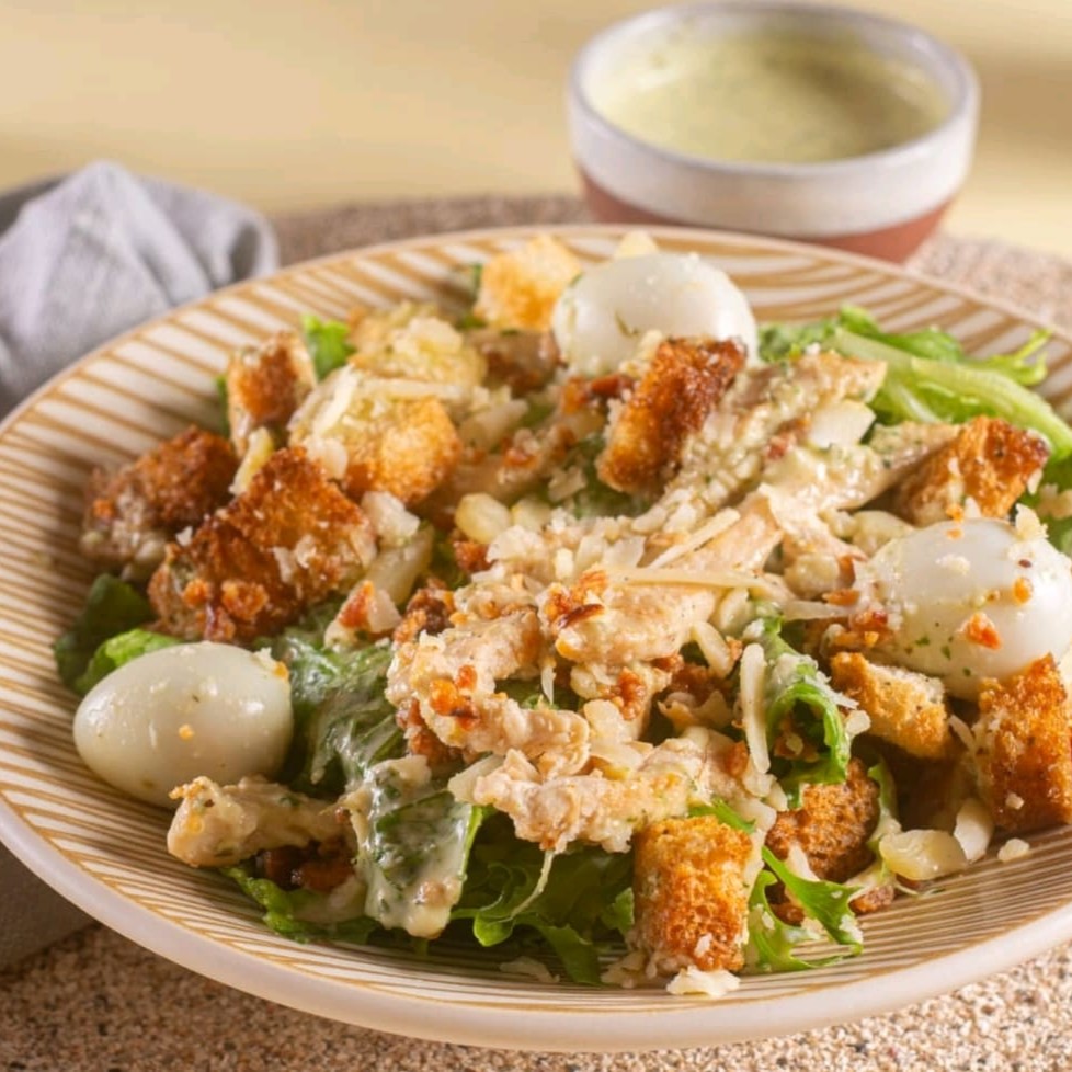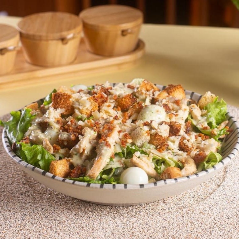 Uma versão menor da nossa clássica Caesar: alface americana, frango grelhado em tiras, parmesão, ovo de codorna, farofinha de bacon, croutons e o nosso molho Caesar especial, já misturado para mais sabor a cada garfada.