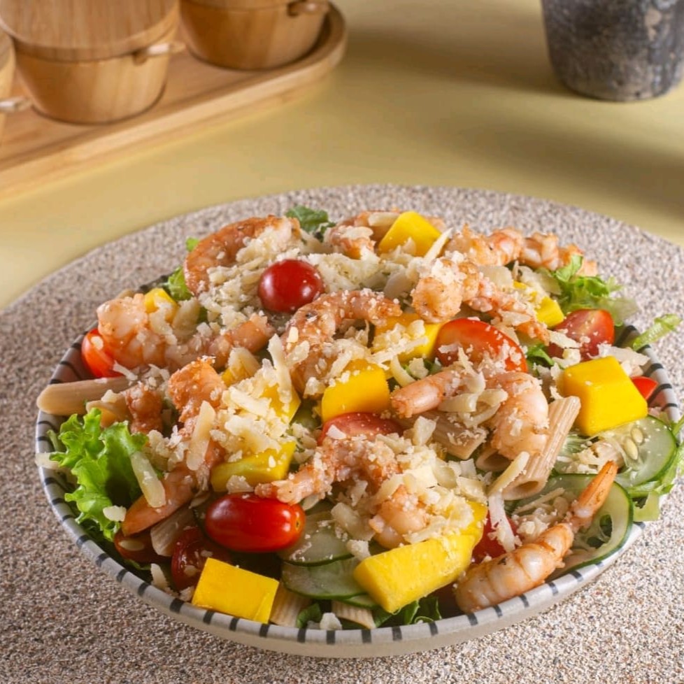 Uma explosão de sabores e texturas em uma salada que mistura o melhor da terra e do mar! Camarões suculentos, ingredientes frescos e aquele toque agridoce que faz toda a diferença: • Base: Mix de folhas frescas • Proteína: Camarões ao alho e óleo • Massa: Penne integral • Frescor: Pepino • Doce e tropical: Manga em cubos • Toque de cor: Tomate cereja • Queijo: Parmesão em lascas • Finalização: Acompanha o molho da sua escolha, já misturado para harmonizar todos os sabores.