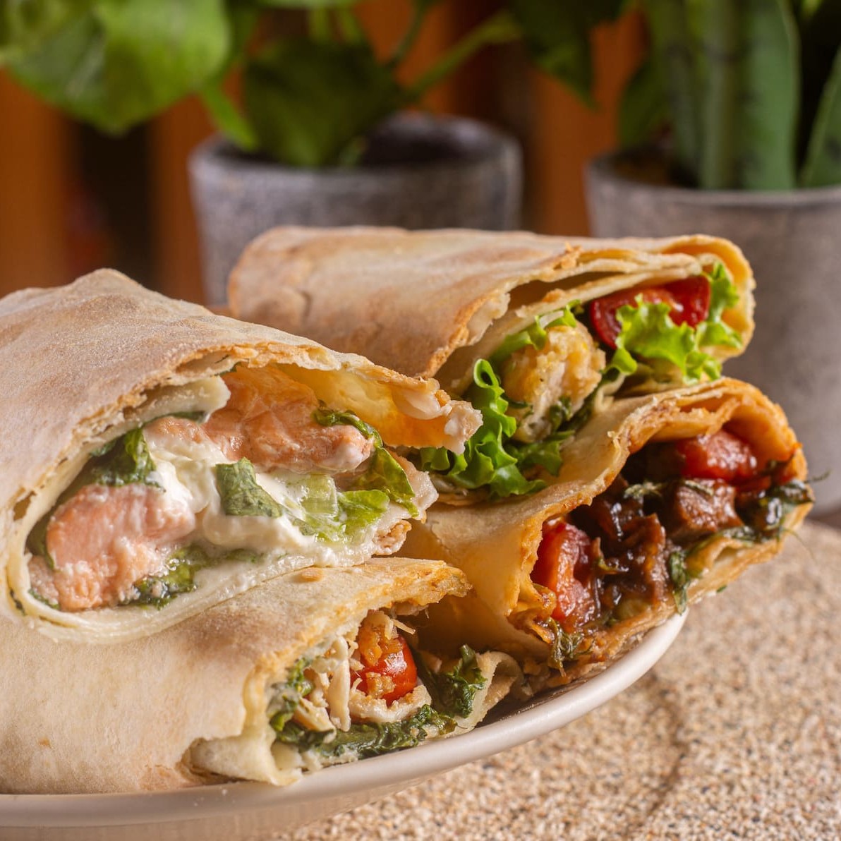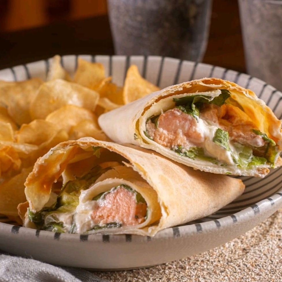 Um wrap leve, cremoso e cheio de sabor! Feito com nossa massa tradicional de pão sírio e ingredientes que combinam frescor e suavidade: • Base: Massa tradicional de pão sírio • Verdes: Mix de folhas frescas • Proteína: Salmão em cubos • Creme: Cream cheese • Molho: Já misturado, deixando o wrap ainda mais suculento e saboroso.