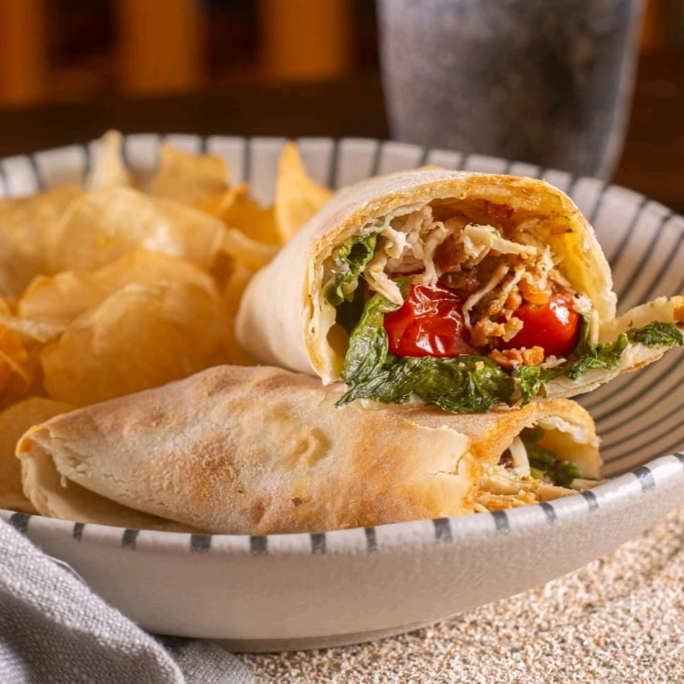 Um wrap leve, saboroso e com aquele toque defumado que faz toda a diferença! • Base: Massa tradicional de pão sírio • Verdes: Mix de folhas frescas • Frescor: Tomate cereja • Proteína: Frango desfiado suculento • Crocância: Bacon crocante • Molho: Caesar defumado, já misturado para envolver todos os ingredientes com muito mais sabor.