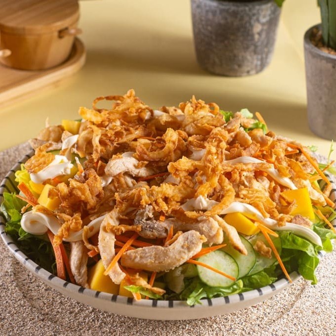 Uma salada leve, colorida e cheia de texturas! Combinação perfeita de sabores com um toque de cremosidade e crocância: • Base: Alface Americana • Massa: Bifum (macarrão de arroz) • Proteína: Frango grelhado em tiras • Frescor: Pepino em rodelas • Colorido: Cenoura • Doce e tropical: Manga • Creme: Cream cheese • Crocância: Crispy de cebola • Finalização: Acompanha o molho da sua escolha, já misturado para dar ainda mais sabor em cada garfada.
