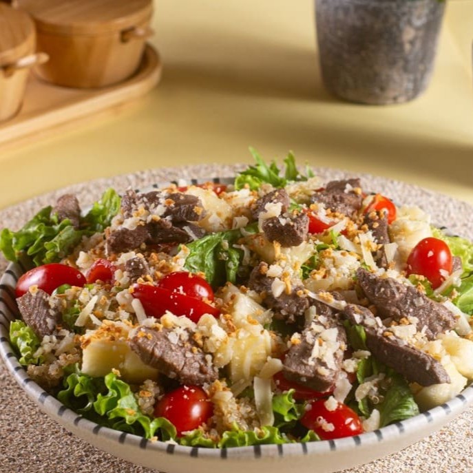 Uma combinação irresistível que une o sabor marcante do mignon ao frescor dos ingredientes naturais. • Base: Mix de folhas frescas • Frescor: Tomate cereja • Grão: Quinoa • Doce e tropical: Abacaxi • Queijo: Parmesão em lascas • Proteína: Mignon em tiras • Crocância e aroma: Alho frito • Finalização: Acompanha o molho da sua escolha, já misturado para deixar tudo ainda mais equilibrado e saboroso.