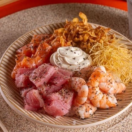 Perfeito para quem ama frutos do mar! Um poke generoso, colorido e cheio de texturas, com três proteínas incríveis que se complementam em cada garfada: • Base: Shari (arroz de sushi temperado) • Proteínas: Salmão em cubos, atum em cubos e camarão cozido • Queijo: Cream cheese • Crocância 1: Crispy de batata doce • Crocância 2: Crispy de cebola • Molho: Escolha o seu – enviado separadamente