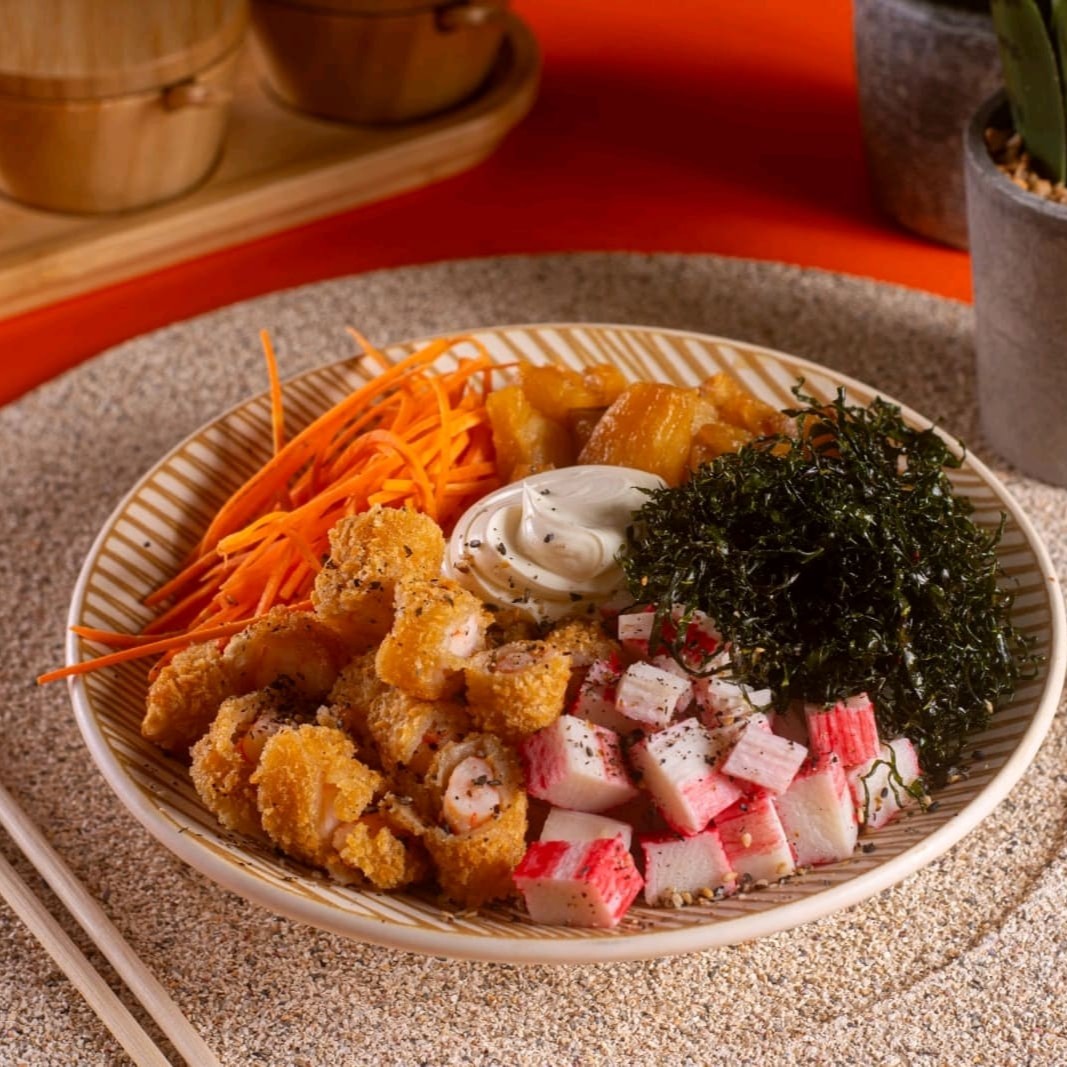 Uma combinação surpreendente de sabores, texturas e contrastes! Crocância, cremosidade, um toque agridoce e muito sabor em cada garfada: • Base: Shari (arroz de sushi temperado) • Proteína: Camarão crispy • Queijo: Cream cheese • Frescor: Cenoura • Doce e grelhado: Abacaxi • Extra: Kani • Crocância final: Crispy de couve • Molho: Escolha o seu – enviado separadamente