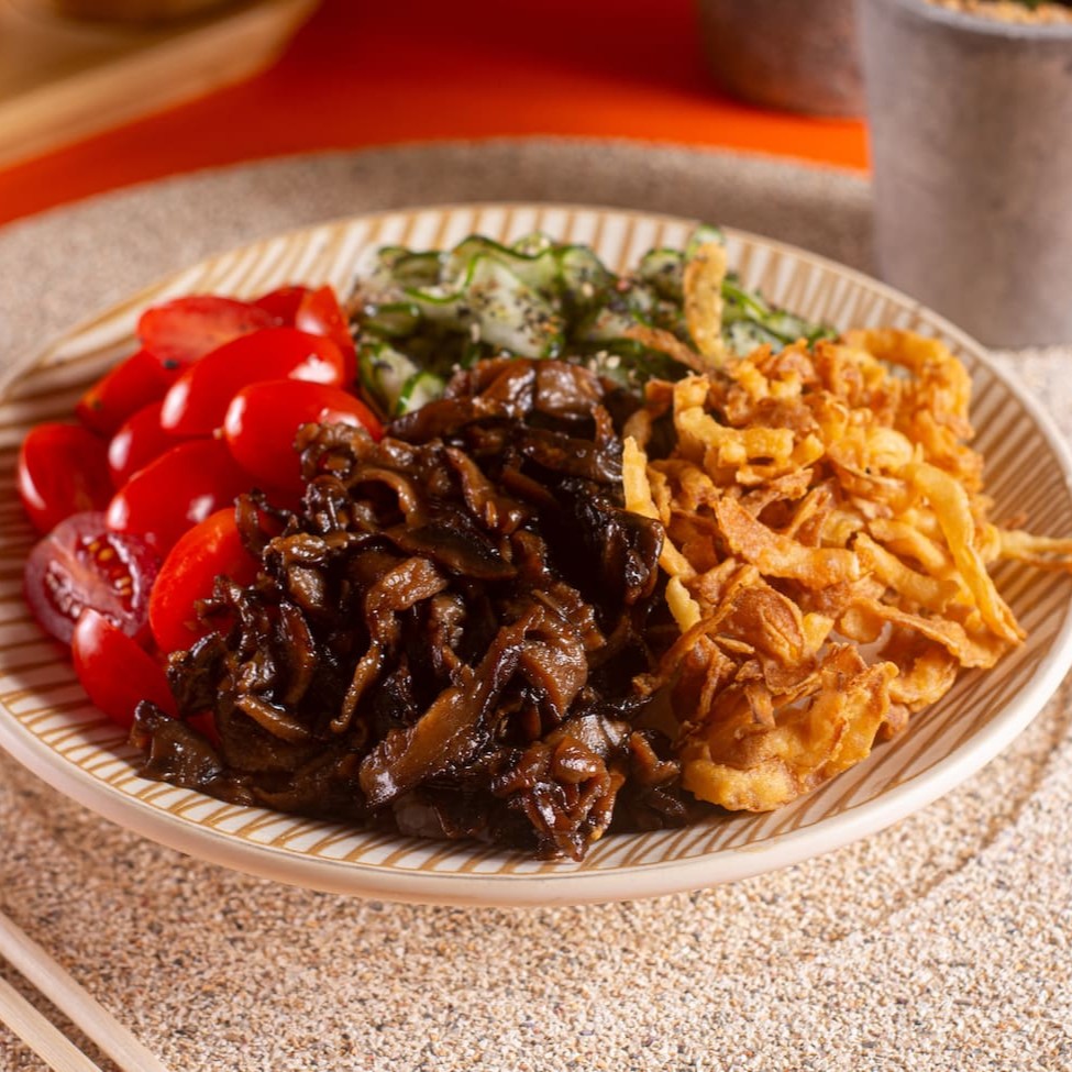 Leve, aromático e cheio de texturas! Uma opção 100% vegana que combina frescor, crocância e muito sabor em cada mordida: • Base: Shari (arroz de sushi temperado) • Proteína vegetal: Shitake levemente salteados • Complemento: Tomate cereja fresco • Refrescância: Sunomono de pepino japonês • Crocância: Crispy de cebola • Finalização: Acompanha o molho da sua escolha, enviado separadamente.