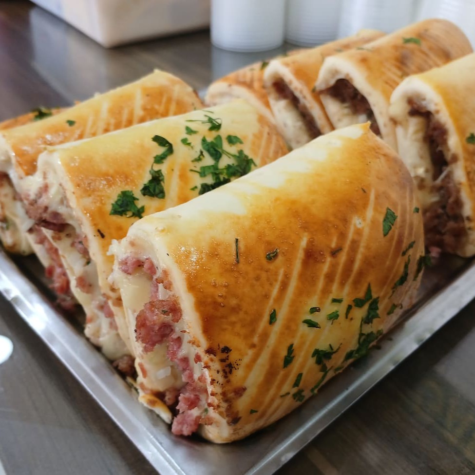 Pastel recheado com calabresa, queijo e presunto, uma explosão de sabores em cada mordida.