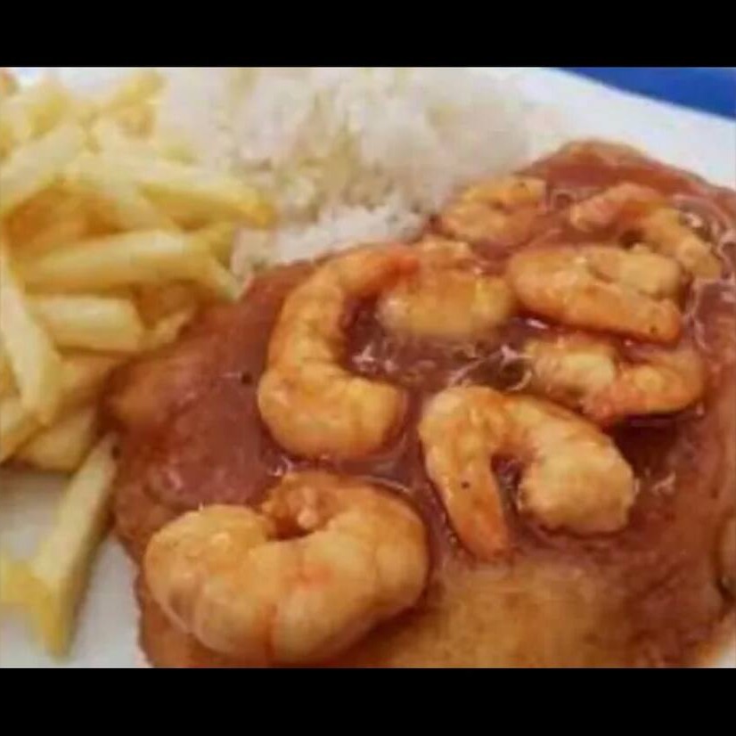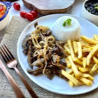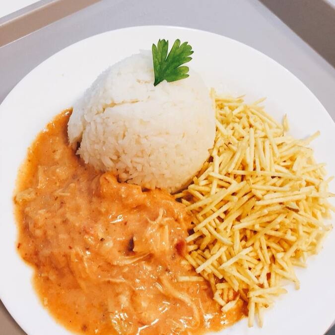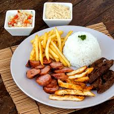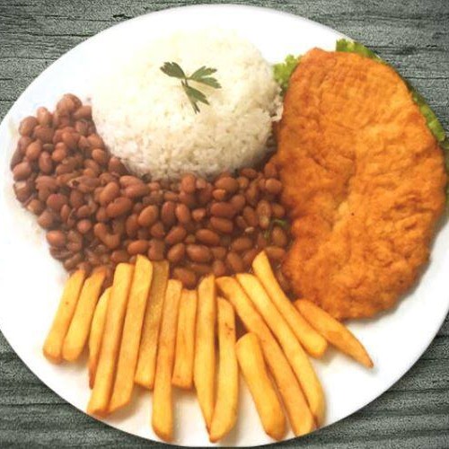Acompanhamentos: arroz, feijão, macarrão e farofa e batata frita.