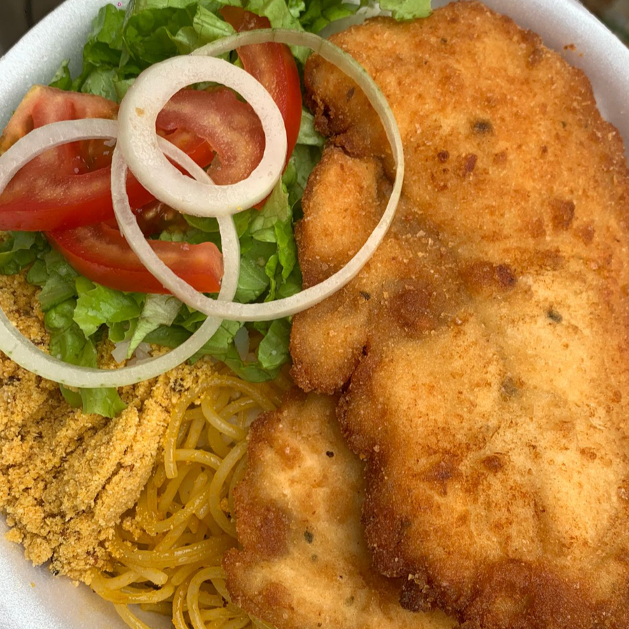 Arroz, feijão, macarrão, farofa, filé de frango a parmegiana e batata frita