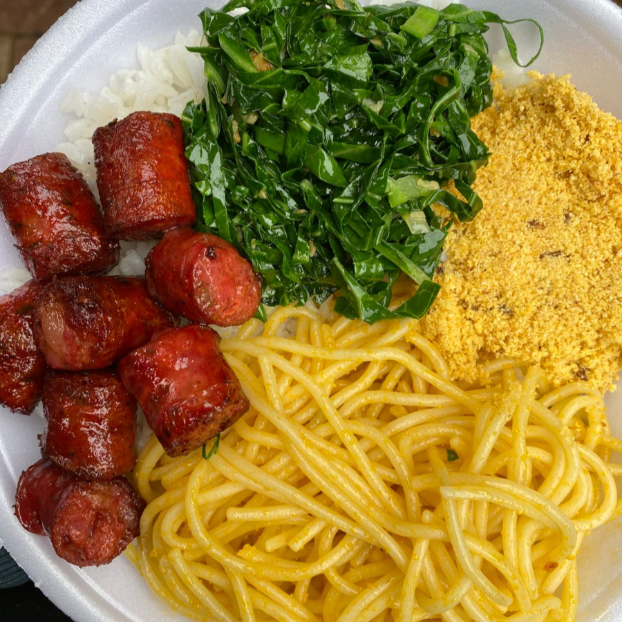 Arroz, feijão, macarrão, farofa, linguiça mineira e couve.