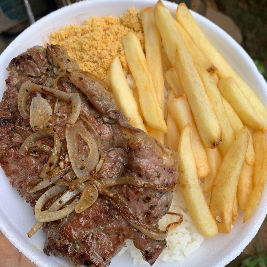 Arroz, feijão, farofa, contra filé e batata frita