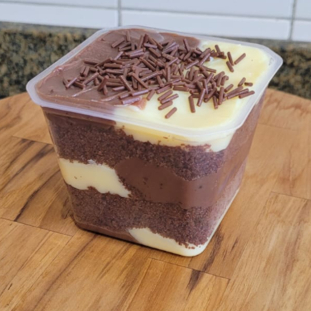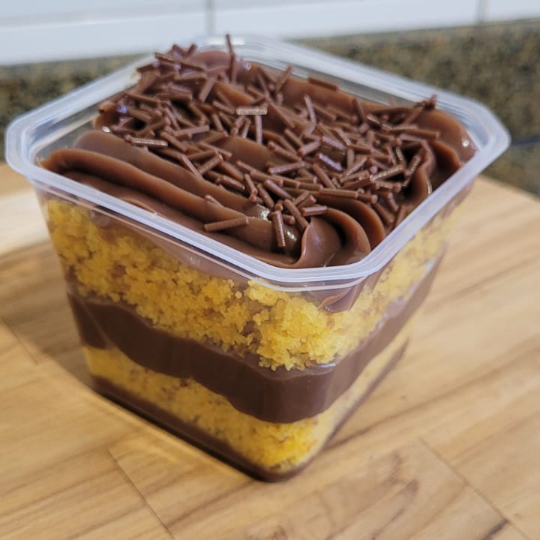 Nosso delicioso bolo caseiro de cenoura, combinado com brigadeiro tradicional e finalizado com granulado. Pote de 250ml.