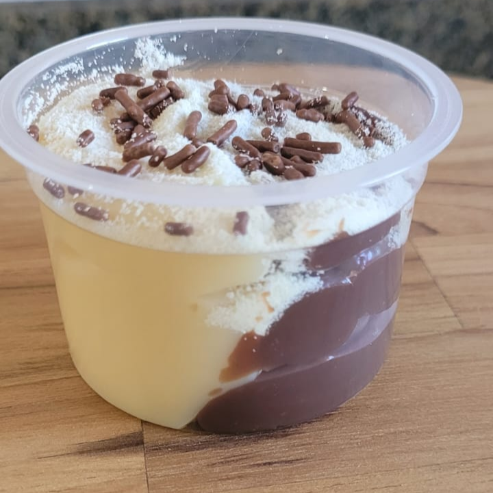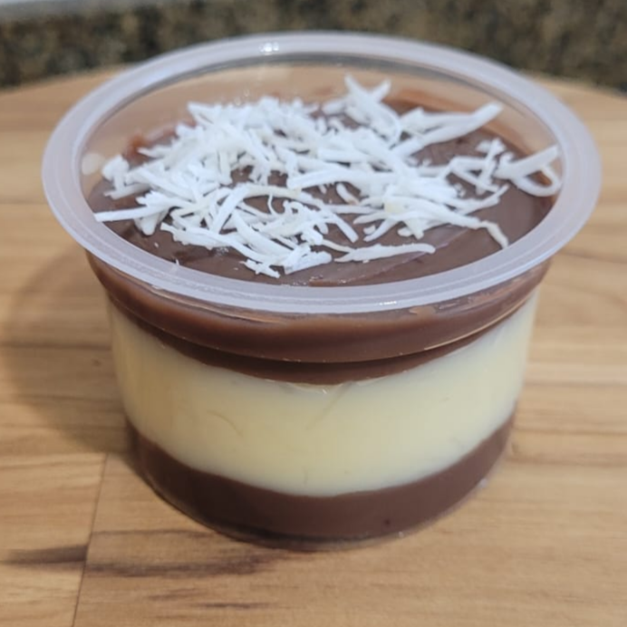 A combinação do brigadeiro tradicional com o cremoso brigadeiro de coco, finalizado com coco ralado, para comer de colher. Copo com aproximadamente 140g.