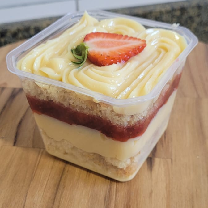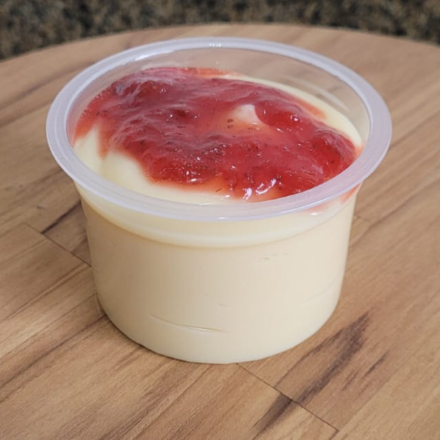 Brigadeiro cremoso de Ninho, finalizado com nossa geleia de morango caseira, para comer de colher. Copo com aproximadamente 140g.
