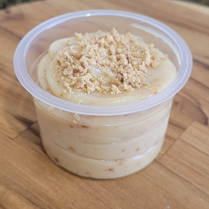 Brigadeiro cremoso de paçoca, finalizado com farofinha de paçoca, para comer de colher. Copo com aproximadamente 140g.