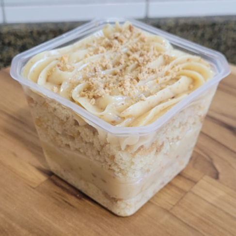Nossa massa de bolo branca acompanhada de um delicioso brigadeiro de paçoca, finalizado com farofinha de paçoca. Pote de 250ml