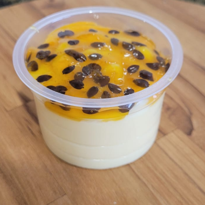 Brigadeiro cremoso de Ninho, finalizado com geleia de maracujá caseira, para comer de colher. Copo com aproximadamente 140g.