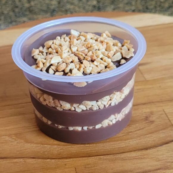 A combinação perfeita do brigadeiro de chocolate tradicional com o amendoim torrado e triturado, para comer de colher. Copo com aproximadamente 140g.