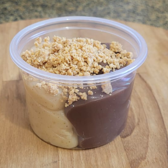 Uma metade brigadeiro de chocolate tradicional e outra metade de brigadeiro de paçoca, finalizado com paçoca triturada, para comer de colher. Copo com aproximadamente 140g.