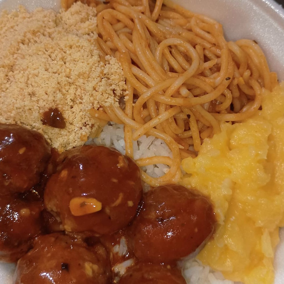 Arroz, feijão, macarrão,farofa,purê e almôndegas com molho