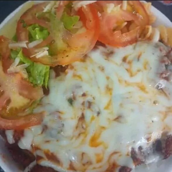 Arroz, feijão, macarrão,farofa e panquecas de carne com um molho extremamente temperado e uma generosa camada de mussarela derretida
