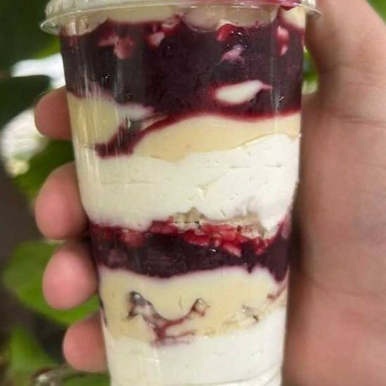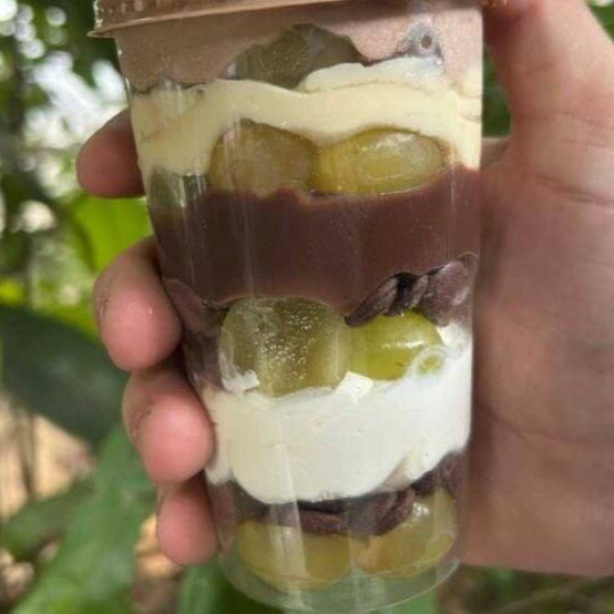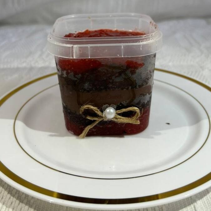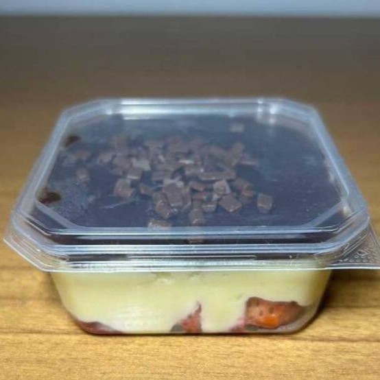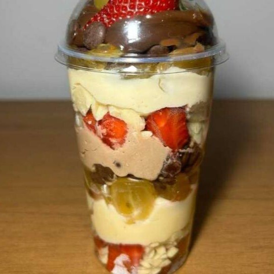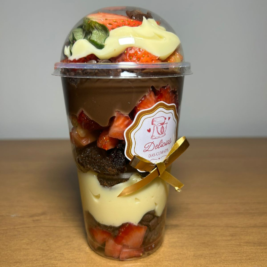 Esta delícia contém morango, uva picados, raspa de chocolate branco, raspa de chocolate preto, mouse de Ninho e mouse de chocolate e creme e Ninho e creme chocolate. Equilíbrio perfeito!