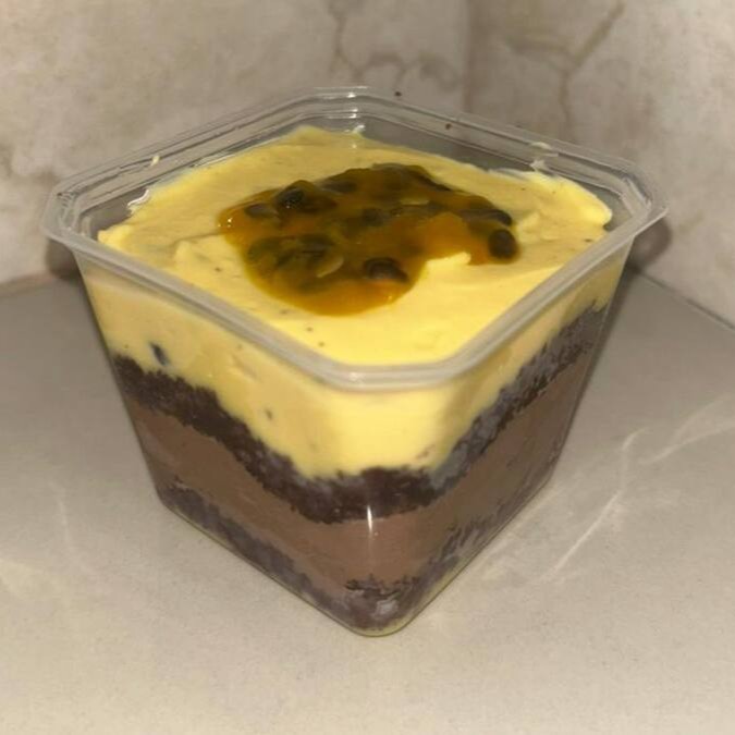 Feito com Massa Preta, com um delicioso e cremoso mousse de maracujá e mousse de chocolate.