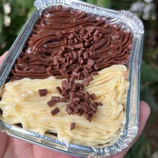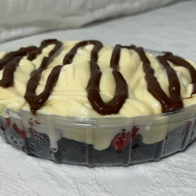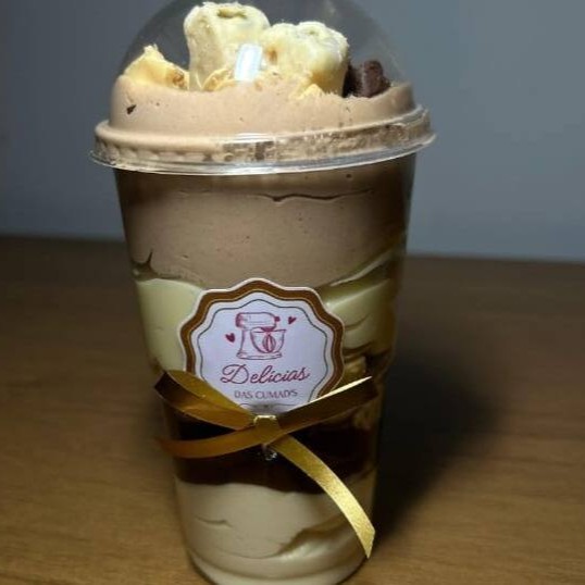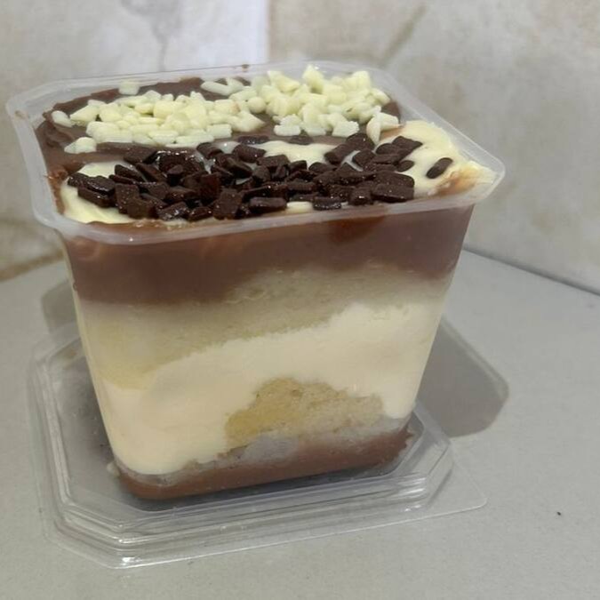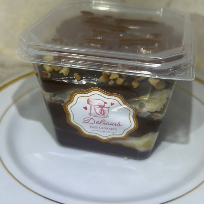 Uma delícia de combinação de creme de Ninho, creme de chocolate , bombom Ouro Branco picado e mousse de chocolate.