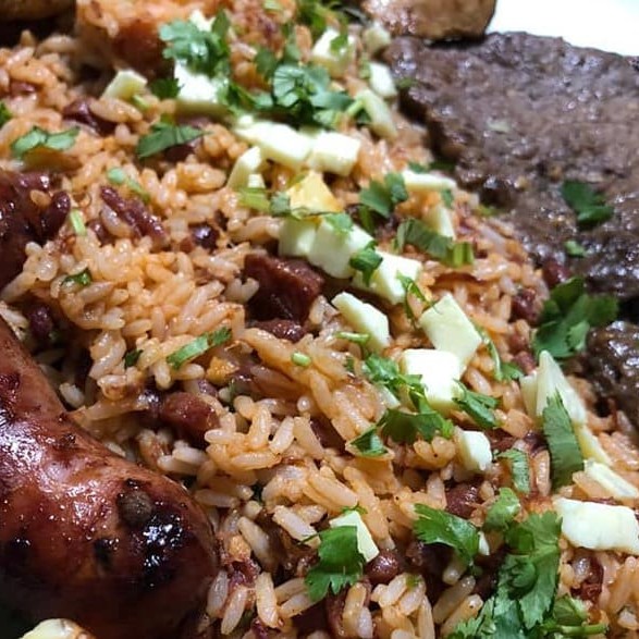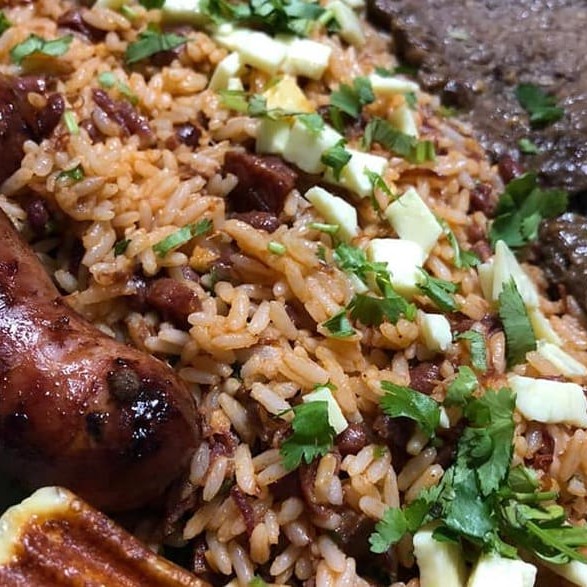 Baião de Dois acompanhado de Frango assado com Fritas.