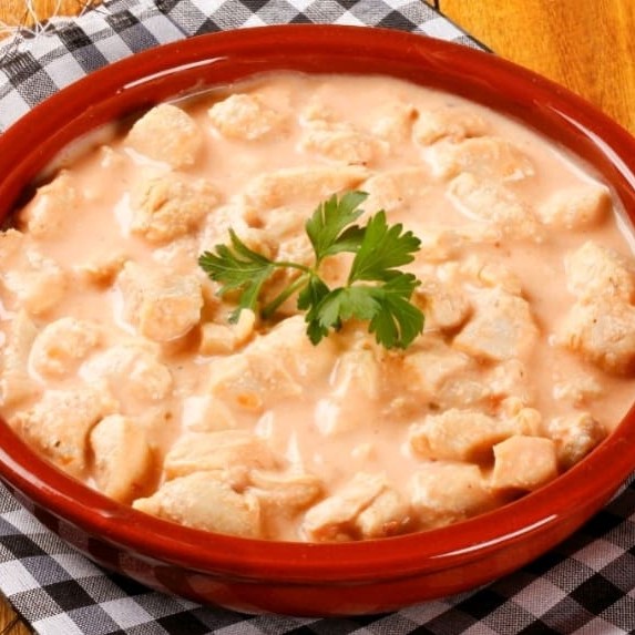 Marmita de Strogonoff de frango, Acompanha arroz, feijão, macarrão, farofa. Podendo escolher mais dois acompanhamentos