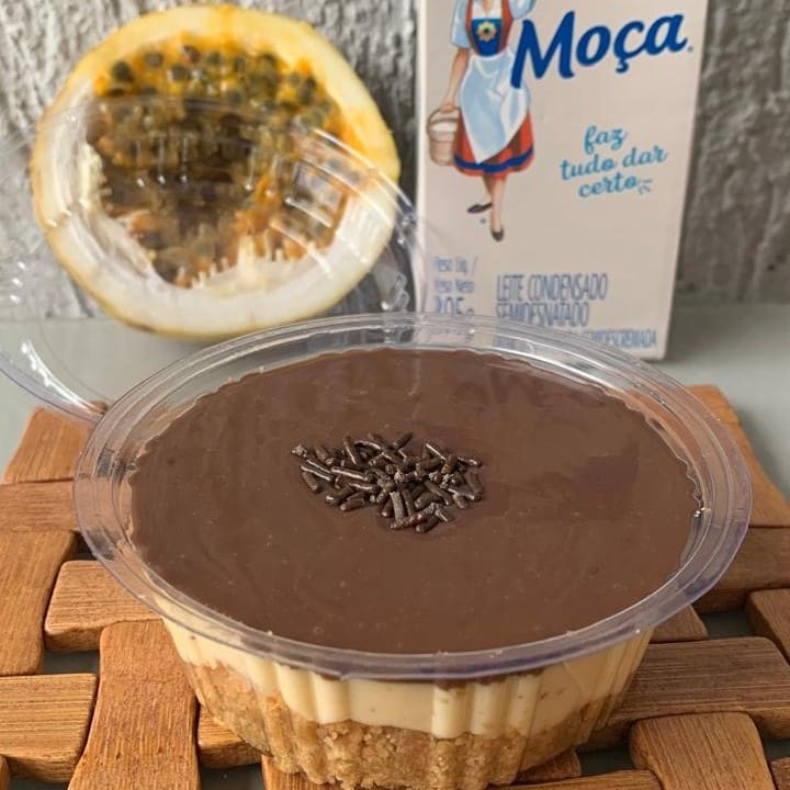 Uma camada de massa de biscoito, com creme de maracujá, com aquele toque doce de ganache de chocolate. Aprox. 150ml