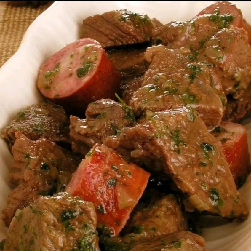 Marmita com arroz, feijão, macarrão , farofa e Picadinho de Carne c/linguiça. Escolha mais dois acompanhamentos. Uma refeição completa e saborosa.