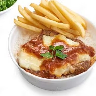 Rejeição parmegianaC/Fritas . Arroz , feijao , batata frira frango empanado ao molho e queijo.