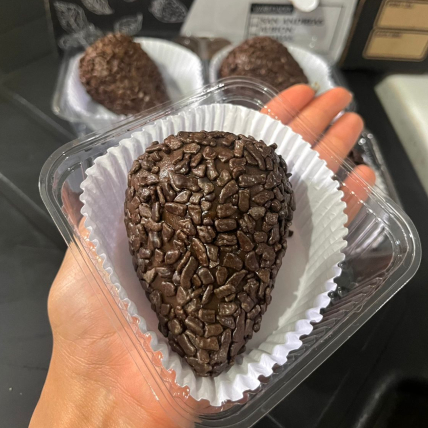 Brownie recheado com brigadeiro 50% e pedaços de morango frescos.