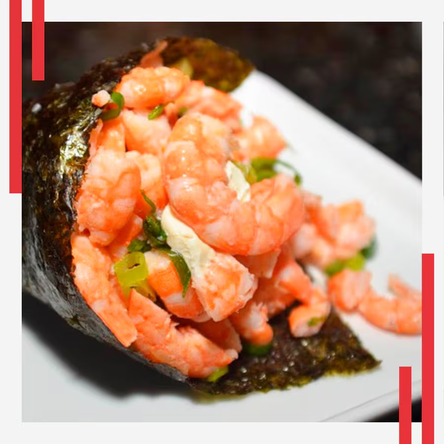 Temaki de salmão fresco com arroz japonês, camarão, cream cheese e gergelim - unid.