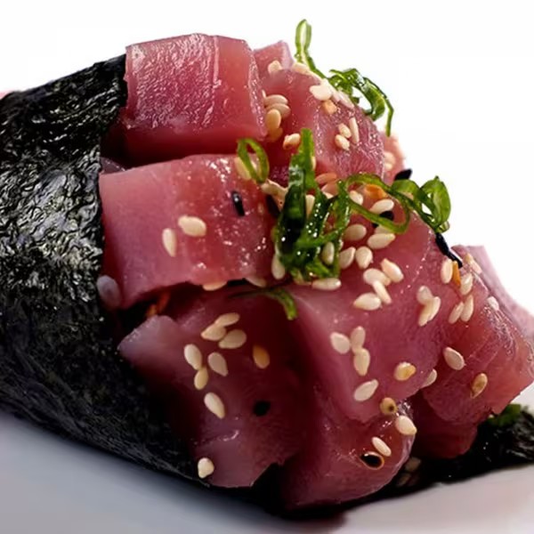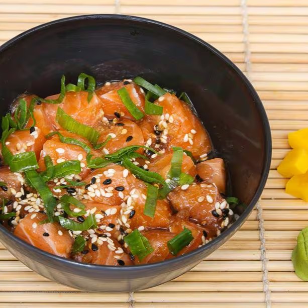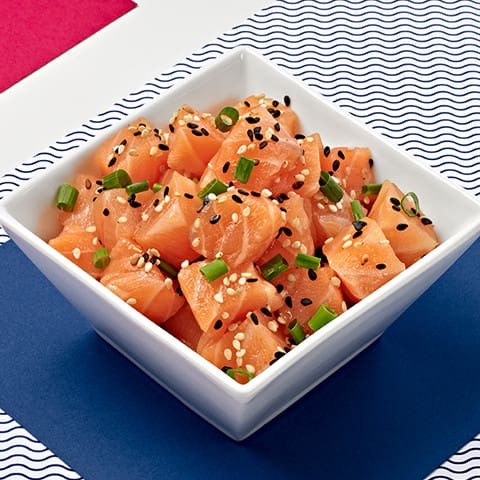 Cubos de salmão ou atum com óleo de gergelim, cebolinha e gergelim moído.