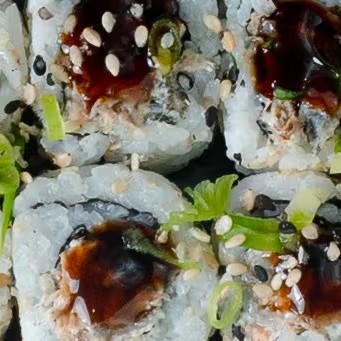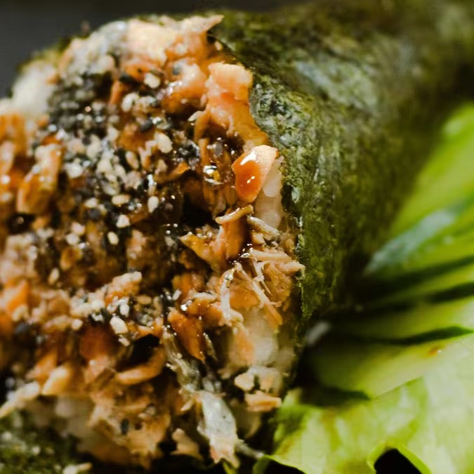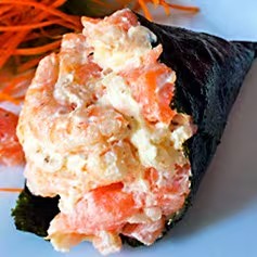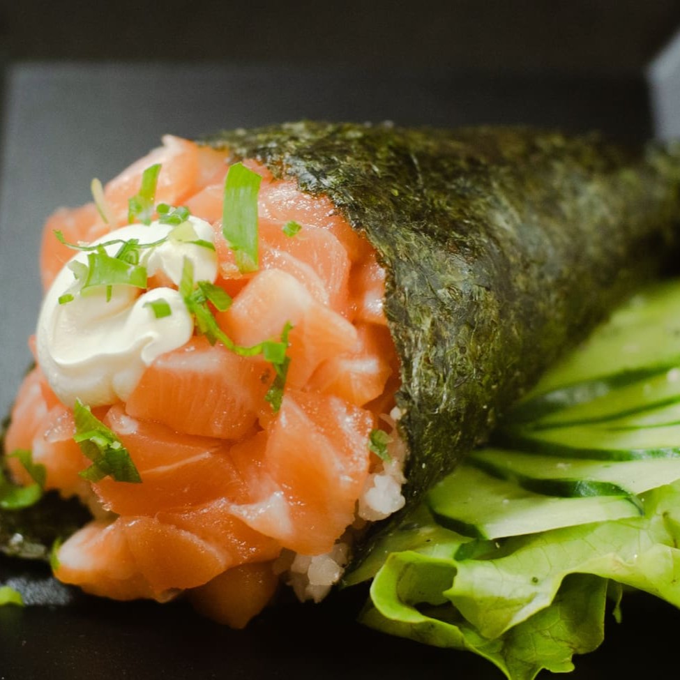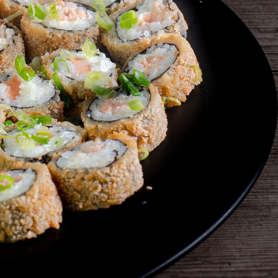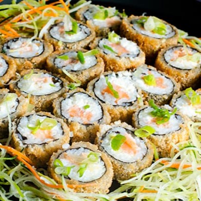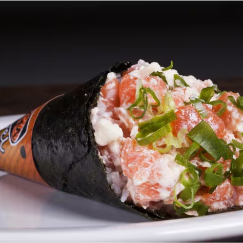 Arroz temperado, salmão, cream cheese, cebolinha e gergelim.