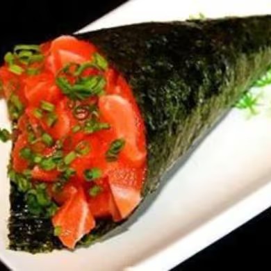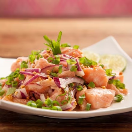 Salmão ou peixe branco fresco marinado em suco de limão, cebola roxa, hondashi e pimentão.