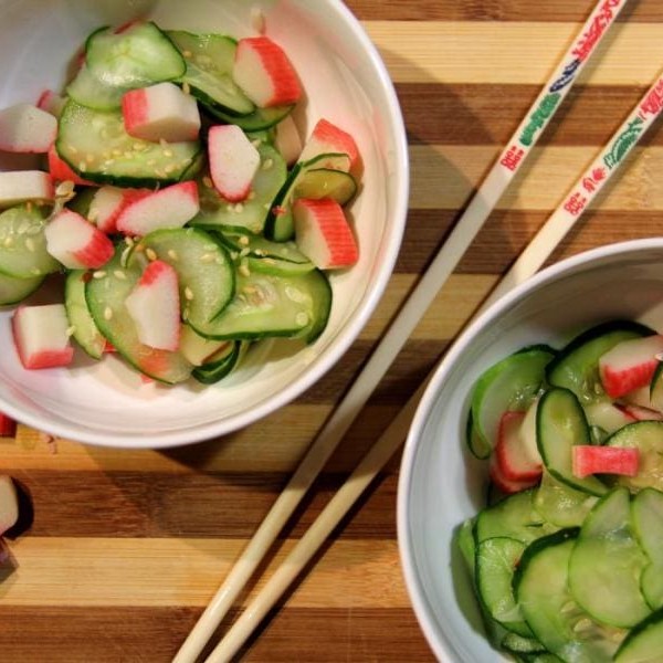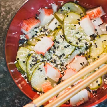 Salada de pepino japonês ao vinagrete com kani e gergelim.