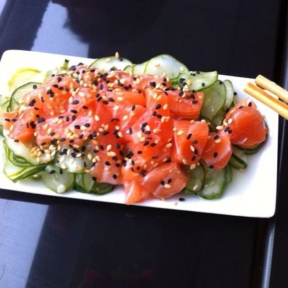 Salada de pepino japonês ao vinagrete com salmão, kani e gergelim.