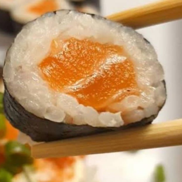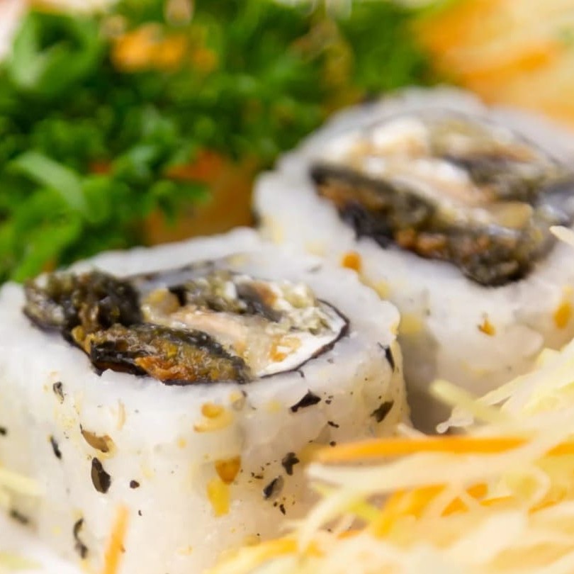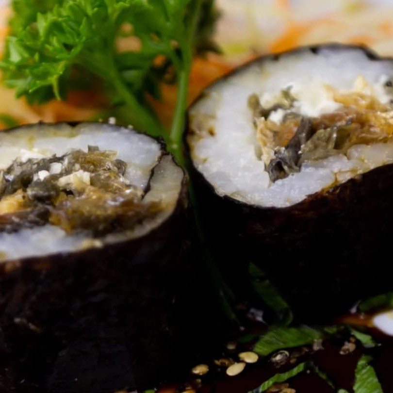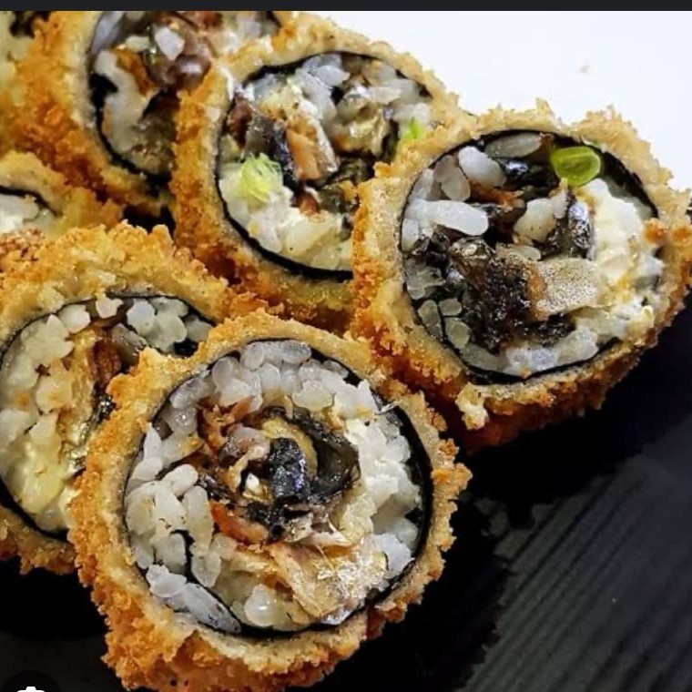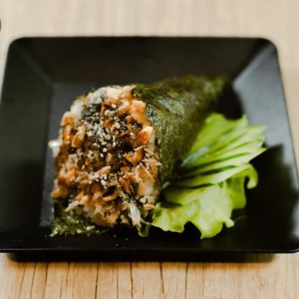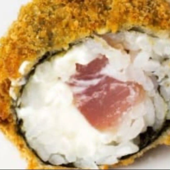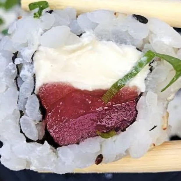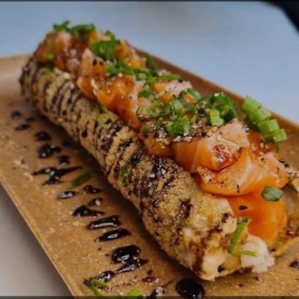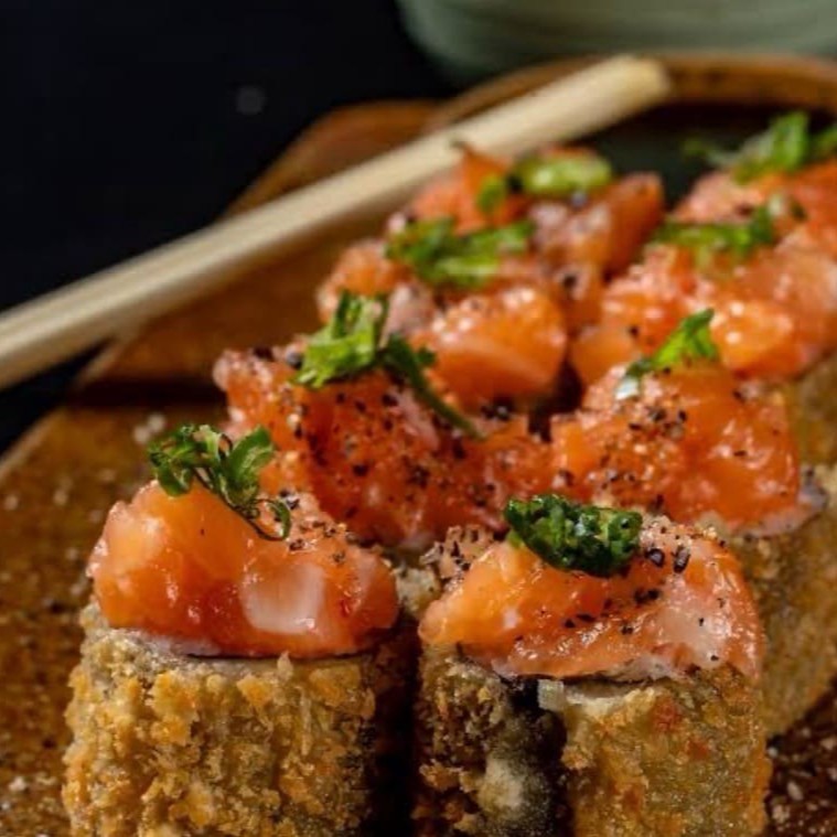 Atum, cream cheese, arroz japonês e cebolinha envoltos em alga com cobertura crocante.